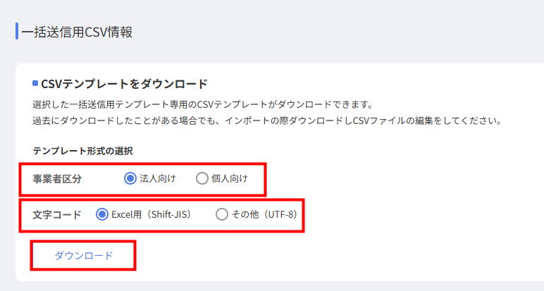 5. 「一括送信用CSV情報」の「CSVテンプレートをダウンロード」で「事業者区分」と「文字コード」を選択し、「ダウンロード」をクリックします。