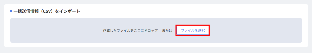 7. 「一括送信情報(CSV)をインポート」で「ファイルを選択」をクリックして編集したCSVファイルを選択するか、ファイルをドラッグ&ドロップします。
