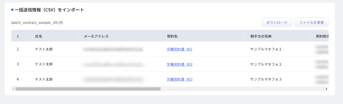 8. 「一括送信情報(CSV)をインポート」にインポートしたCSVファイルの内容が反映したことを確認します。