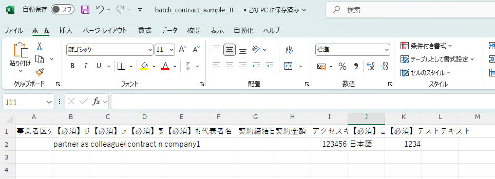 ダウンロードしたテンプレートファイルの2行目には、具体例としてサンプルデータが入力されています。