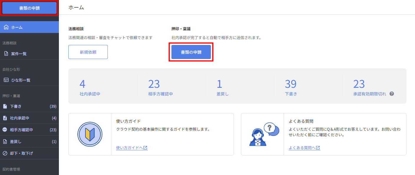 1. 左メニューまたは「ホーム」画面の「書類の申請」をクリックします。