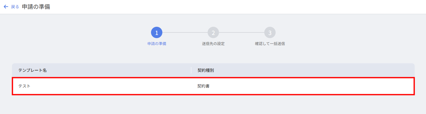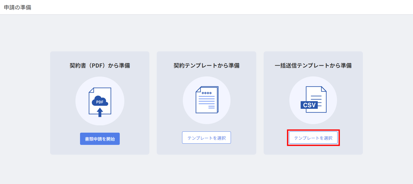 2. 「申請の準備」画面の「一括送信テンプレートから準備」で「テンプレートを選択」をクリックします。