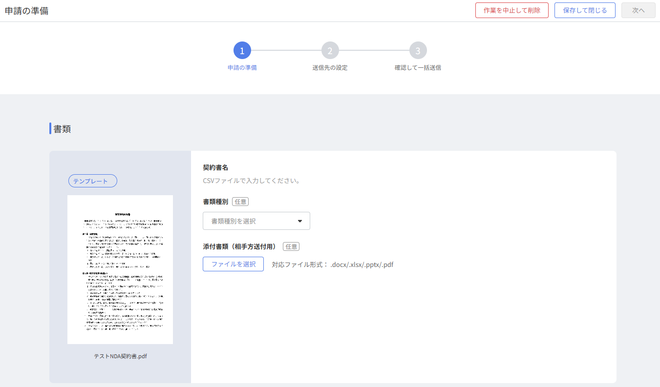 4. 「書類」と「契約情報」の必須項目を入力します。