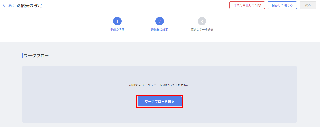1. 「送信先の設定」画面で「ワークフローを選択」をクリックします。