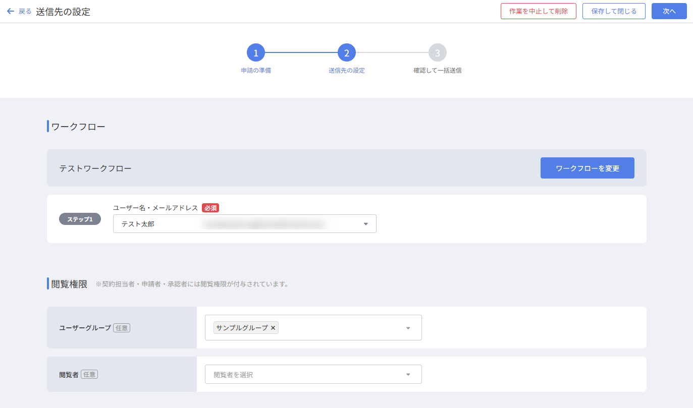 閲覧権限 本申請の閲覧権限を付与する「ユーザー」または「ユーザーグループ」を設定できます。