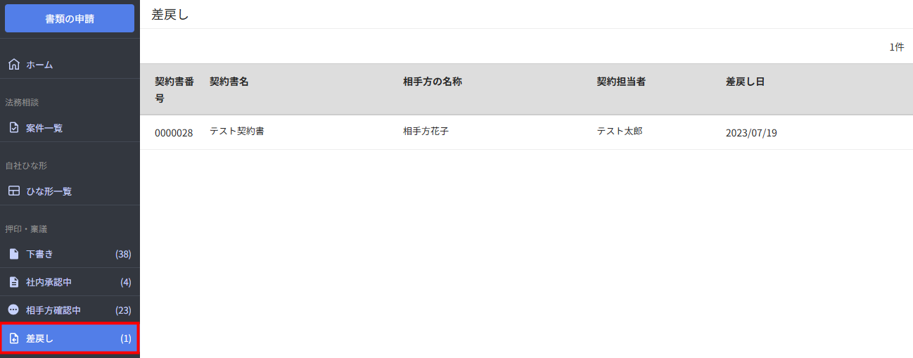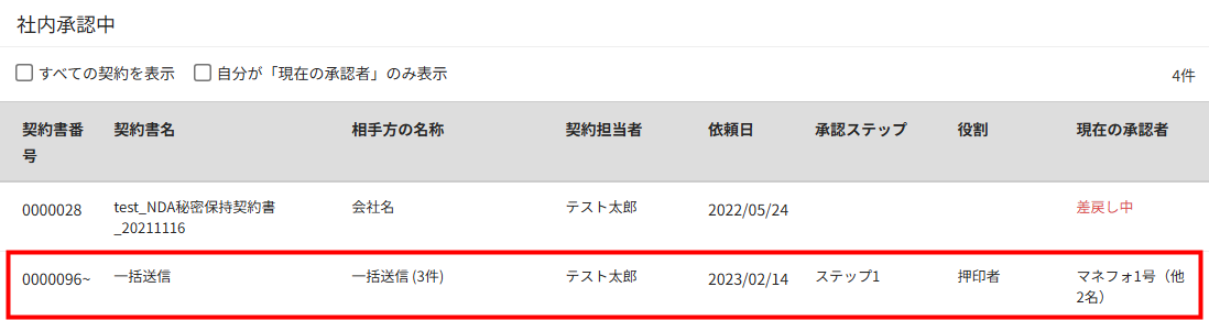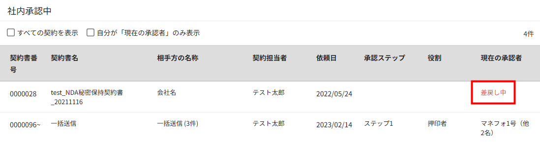- 契約書を複数申請している場合、すべての契約書が差戻されます。