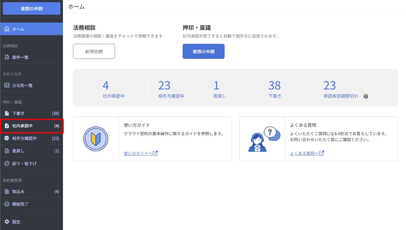 差戻した書類は、「社内承認中」または「差戻し」画面で確認が可能です。