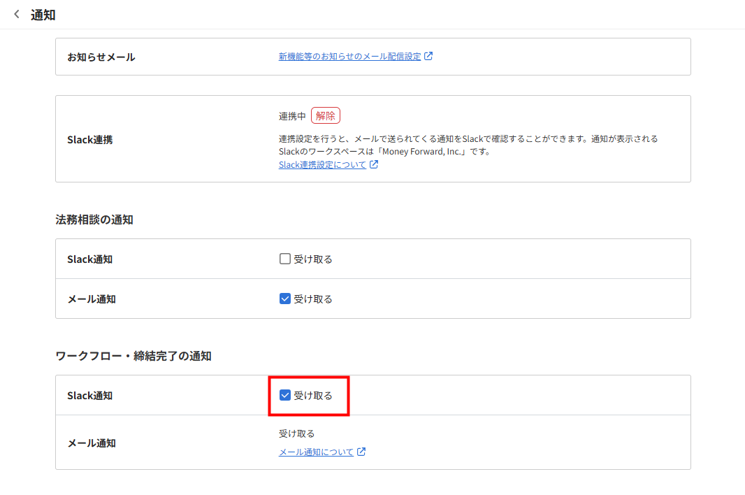 - 「通知」画面の「ワークフロー・締結完了の通知」内の「Slack連携」にある「受け取る」にチェックを入れます。