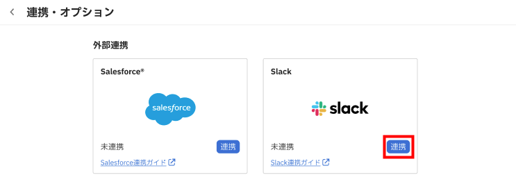 - 「連携・オプション」画面で「Slack」の「連携」をクリックします。