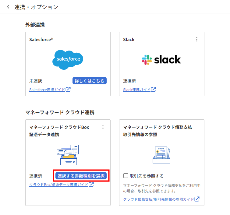 • 「マネーフォワード クラウドBox(証憑データ連携)」画面で「連携する」にチェックを入れた書類種別である