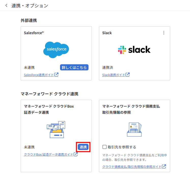 3. 連携・オプション」画面で「マネーフォワード クラウドBox 証憑データ連携」の「連携」をクリックします。