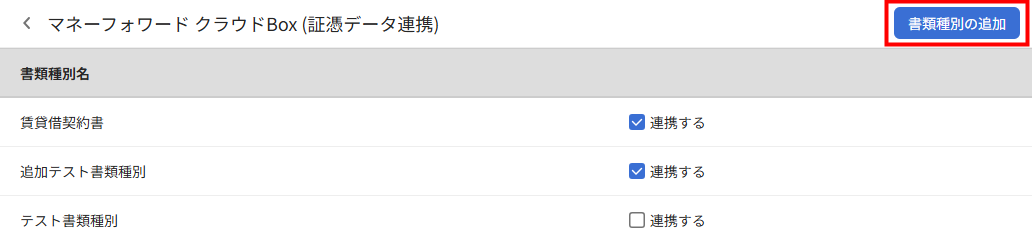 5. 「マネーフォワード クラウドBox」と連携する書類種別にチェックを入れ、「書類種別の追加」をクリックします。