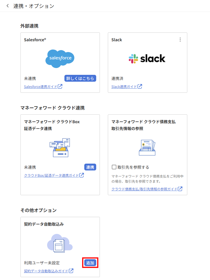 - 「連携・オプション」画面で「契約データ自動取込み」の「追加」をクリックします。