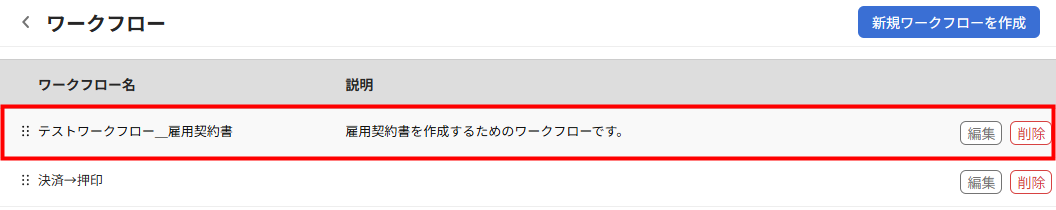 - 「ワークフロー」画面でワークフローの右側にある「削除」をクリックします。