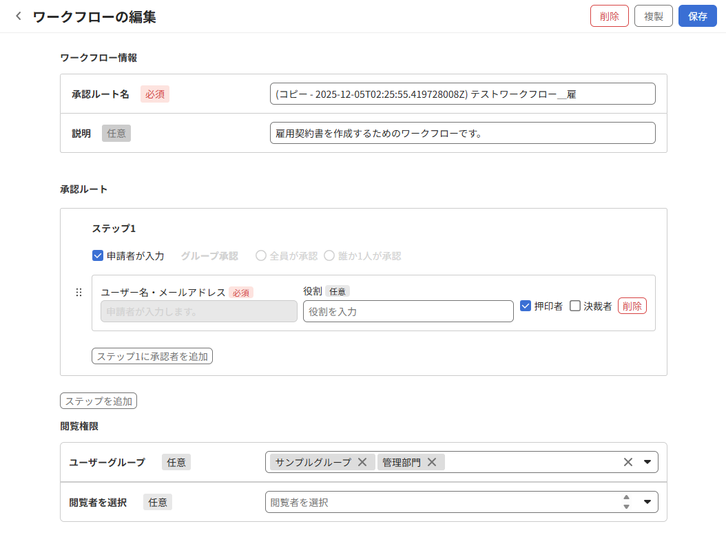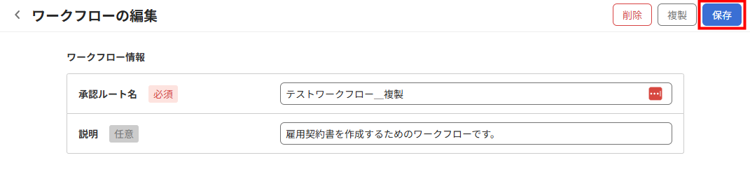 - 「ワークフローの編集」画面で複製元のワークフロー情報が引き継がれていることを確認します。