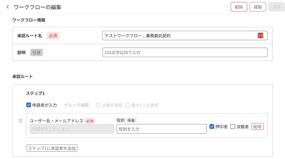 | ④ | ユーザー名・メールアドレス | 承認者として設定するユーザーを指定します。 「申請者が入力」を選択した場合は指定できません。 |