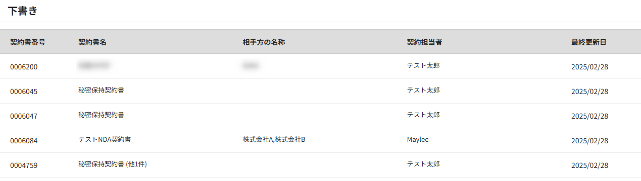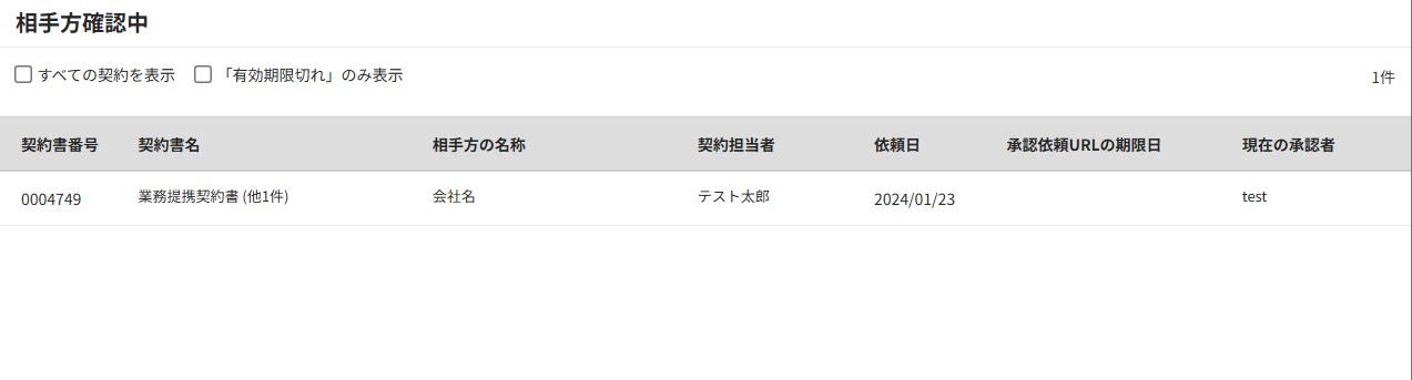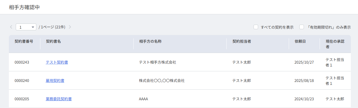 「社内承認中」画面と「相手方確認中」画面の左上に、表示対象の契約書を指定できるチェックボックスを設置しました。