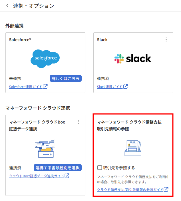 これに伴い、2026年2月24日(火)をもって、「連携・オプション」画面の「マネーフォワード クラウド債務支払 取引先情報の参照」欄が非表示となります。