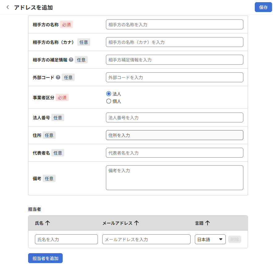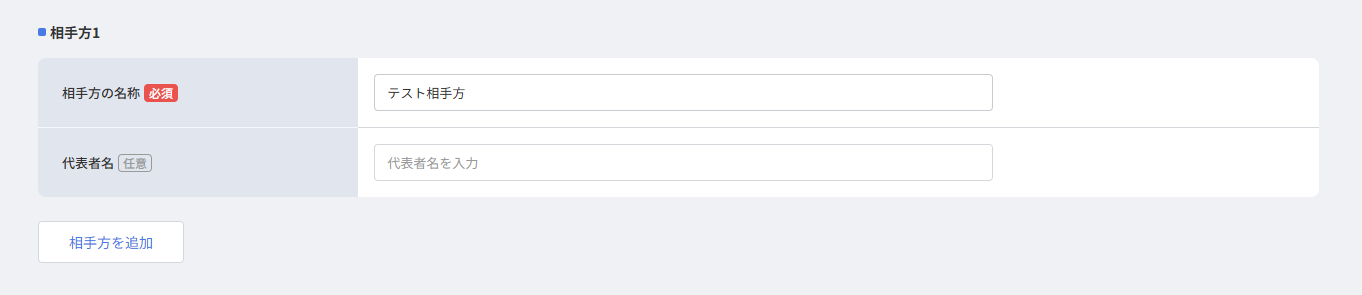 法人情報を選択すると、「相手方の名称」「法人番号」「住所」を自動で反映できます。
