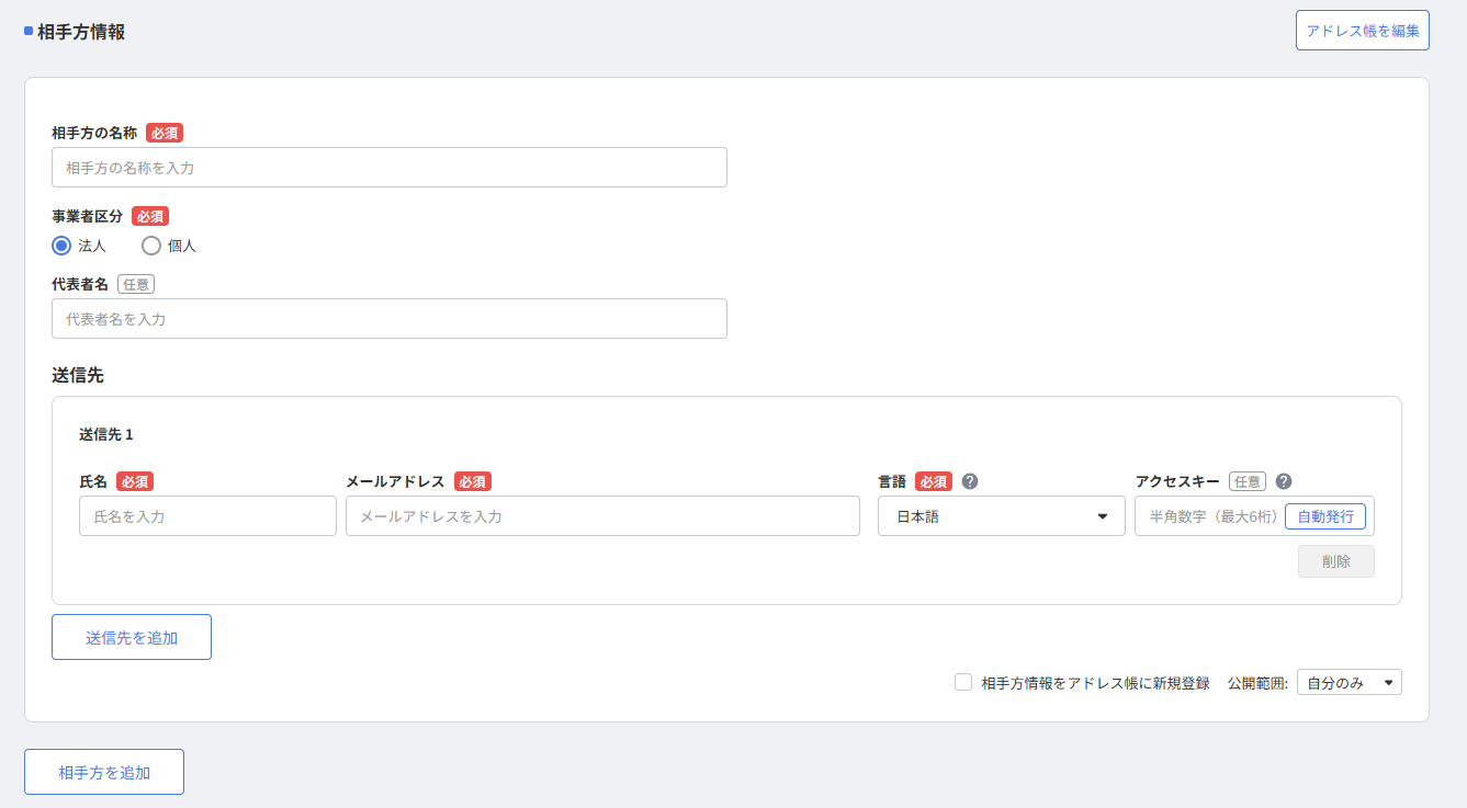 アドレス帳で相手方の情報を追加・編集する場合、「公開範囲」を「事業者」または「自分のみ」から選択できるようになりました。