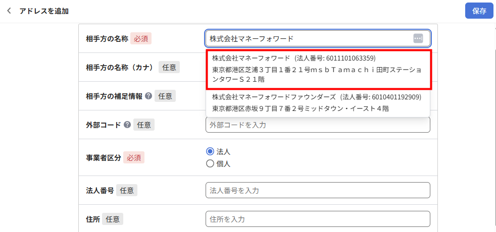 相手方の「事業者区分」で「法人」を選択し、「相手方の名称」または「法人番号」を入力すると、法人情報が提案されます。
