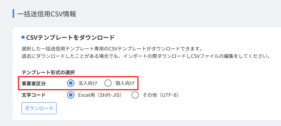 「一括送信用CSV情報」において、CSVテンプレートのダウンロード時に事業者区分を選択する仕組みになりました。