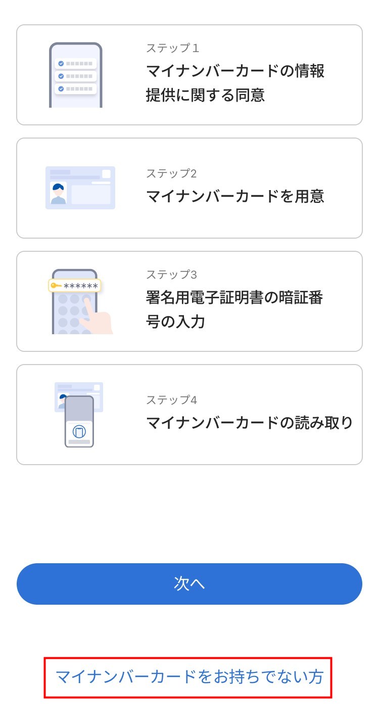 マイナンバーカードをお持ちでない場合は、スマートフォンアプリの「マイナンバーカードの認証」画面で「マイナンバーカードをお持ちでない方」をタップし、本人確認を行ってください。