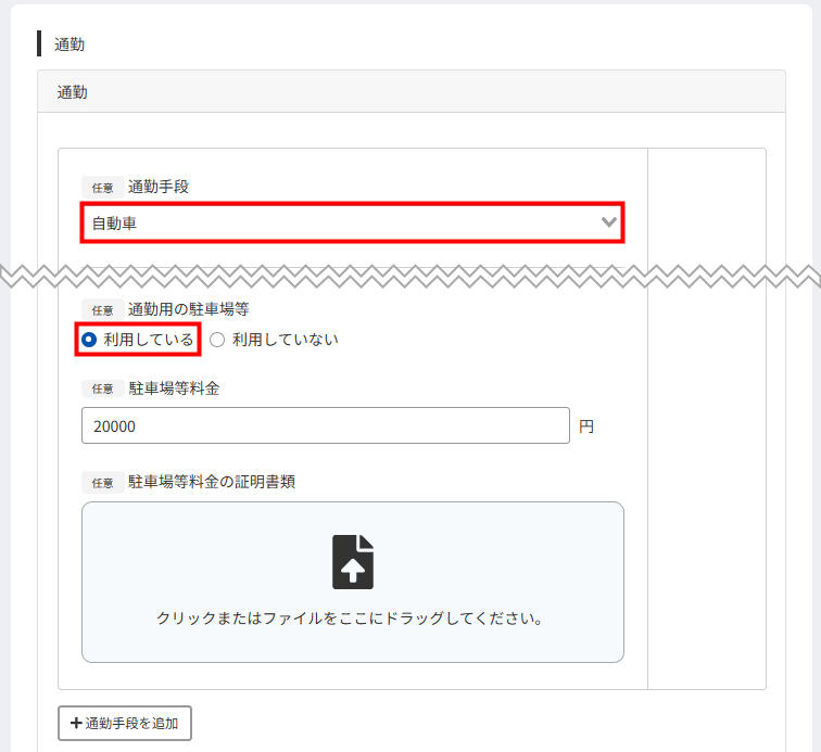 申請者が「通勤手段」で「自動車」「バイク」「自転車」のいずれかを選択し、かつ「通勤用の駐車場等」で「利用している」を選択すると、申請者は駐車場等の情報を申請できます。
