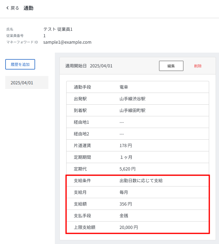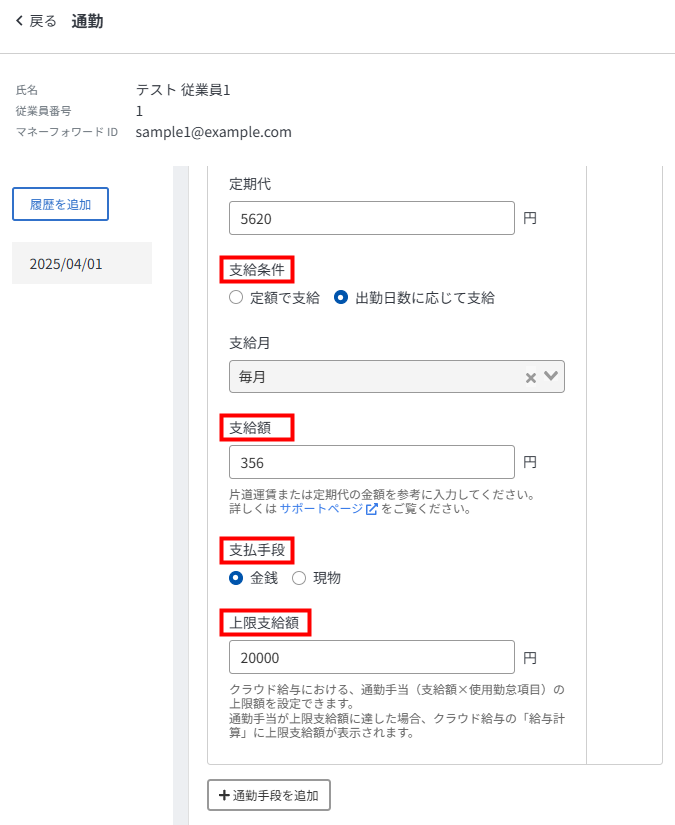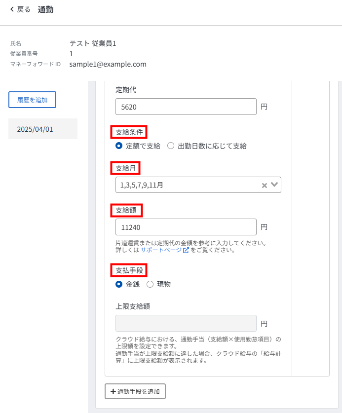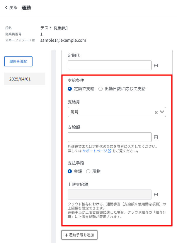 5. 「通勤」の編集画面で「支給条件」「支給月」「支給額」「支払手段」「上限支給額」を設定します。