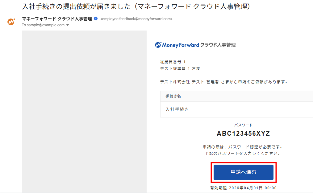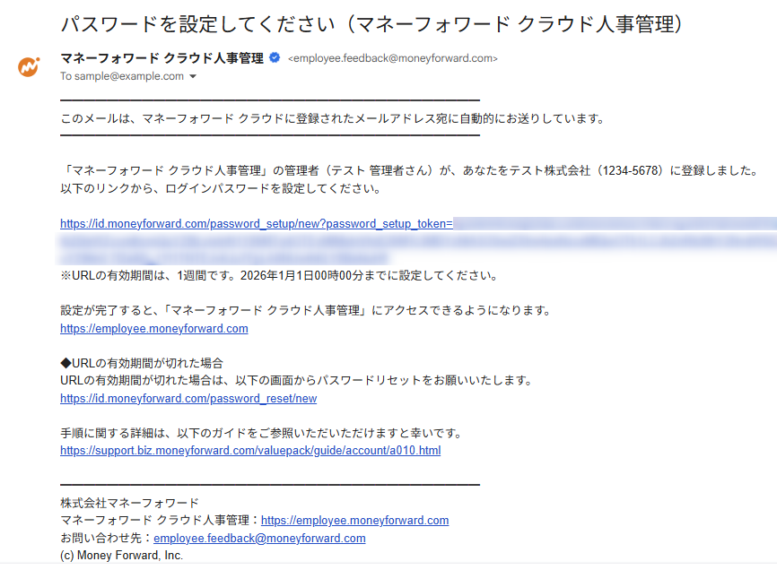 招待を行ったメールアドレス宛に、「パスワードを設定してください(マネーフォワード クラウド人事管理)」という件名のメールが届きます。