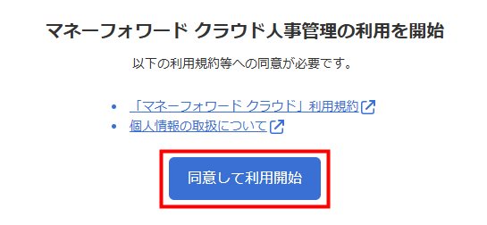 3. 「マネーフォワード クラウド人事管理の利用を開始」画面にて、「同意して利用開始」をクリックします。