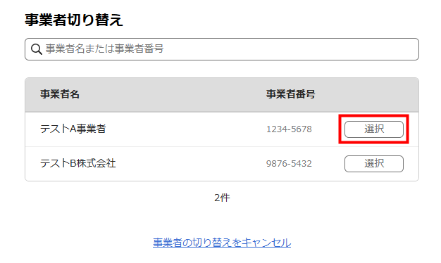 5. 「事業者切り替え」画面にて、ログインを希望する事業者の「選択」をクリックします。