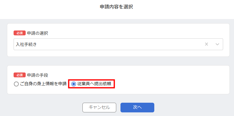 3. 「申請の手段」で「従業員へ提出依頼」を選択します。
