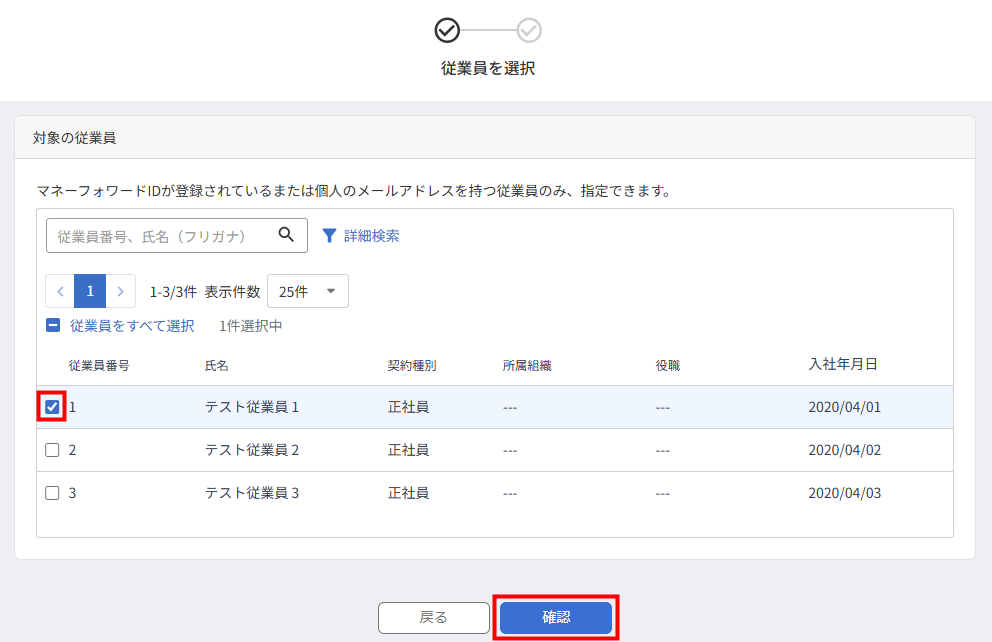 5. 「従業員を選択」画面で対象の従業員を選択して、「確認」をクリックします。