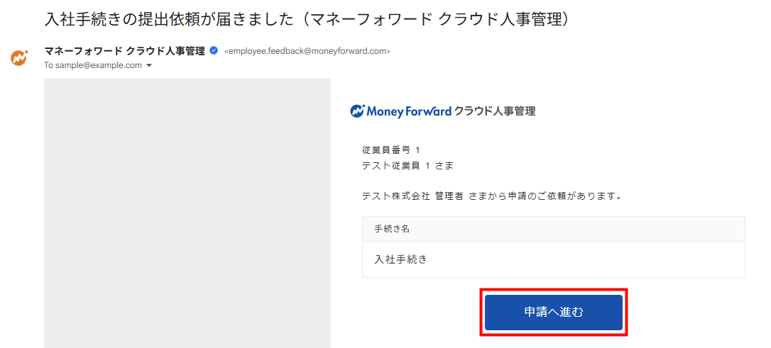 1. 提出依頼メールの「申請へ進む」をクリックします。