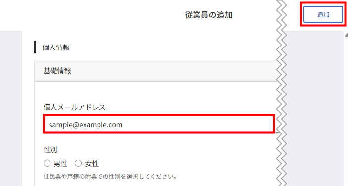 3. 「従業員の追加」画面で「個人メールアドレス」を登録し、右上の「追加」をクリックします。