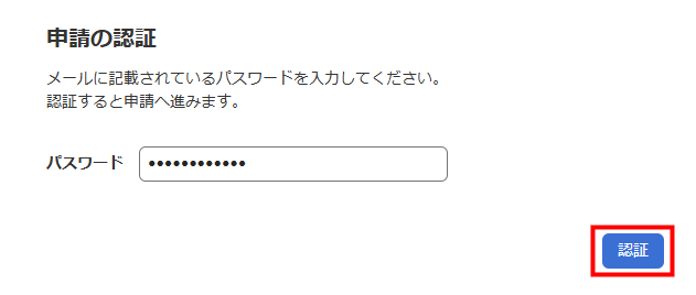 2. 申請の認証画面にてパスワードを入力し、「認証」をクリックします。