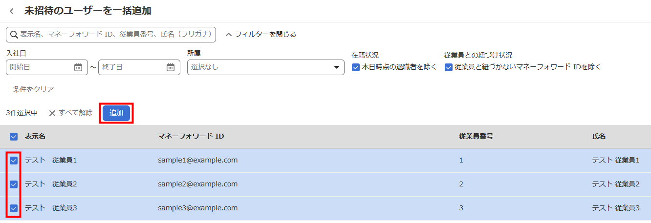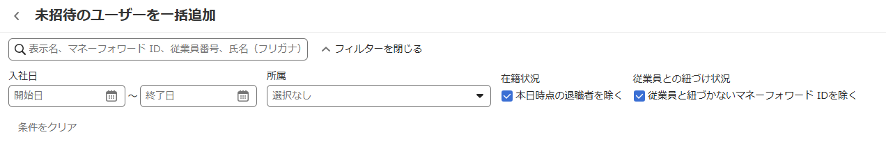 - 「未招待のユーザーを一括追加」画面で招待するユーザーを検索します。
