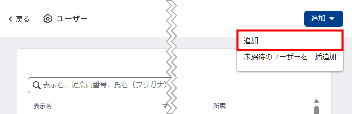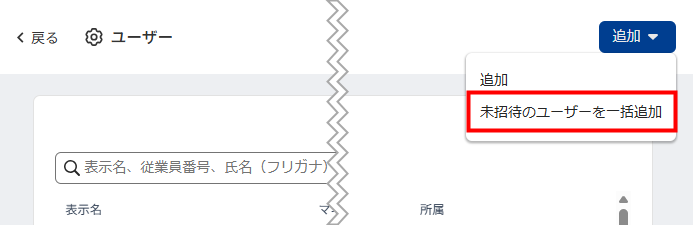 - 「ユーザー」画面右上の「追加」をクリックし、「未招待のユーザーを一括追加」を選択します。