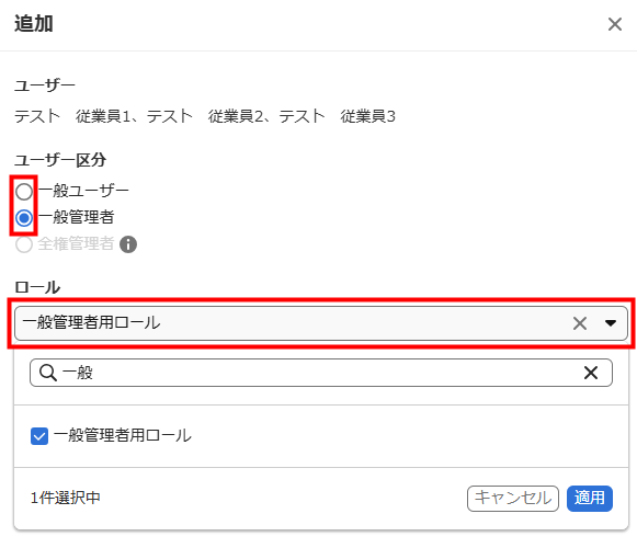 「全権管理者」や「一般ユーザー」にロールを割り当てることはできません。