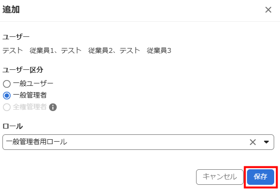 「一般管理者」に変更する場合は、「ロール」も選択してください。
