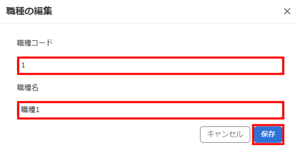 3. 「職種の編集」画面で「職種コード」と「職種名」を修正し、「保存」をクリックします。