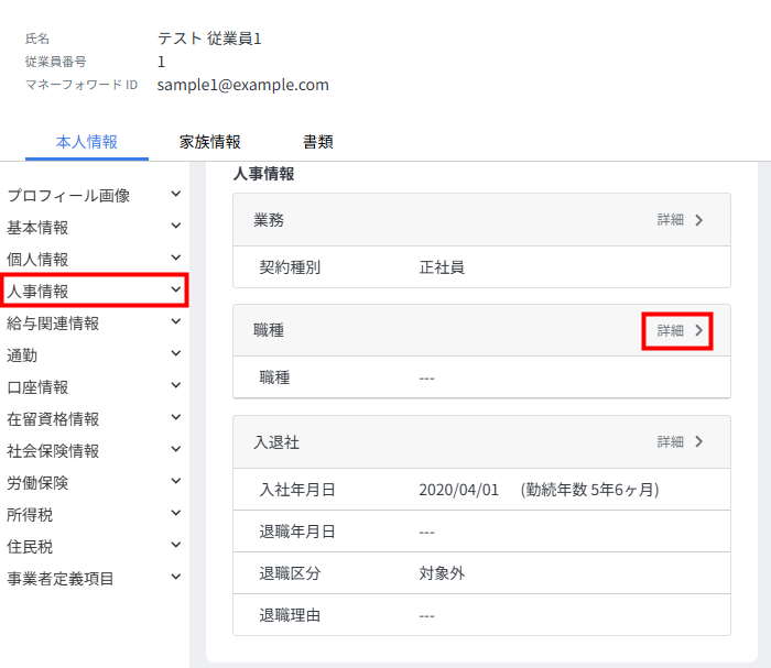 2. 従業員の「本人情報」タブで「職種」の右側にある「詳細」をクリックします。