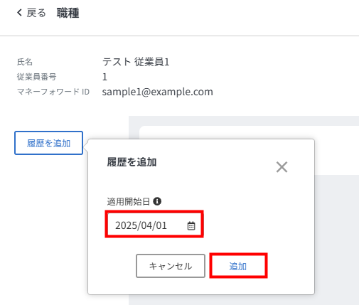 4. 「適用開始日」を入力し、「追加」をクリックします。