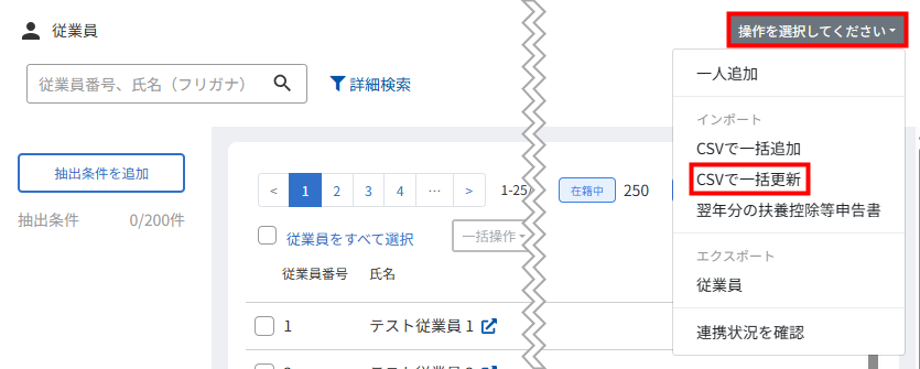 「従業員」画面では、従業員の「職種」をCSVで一括更新できます。