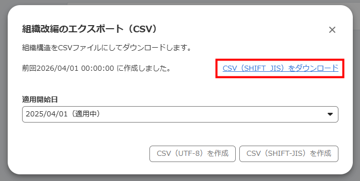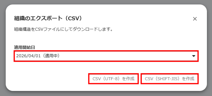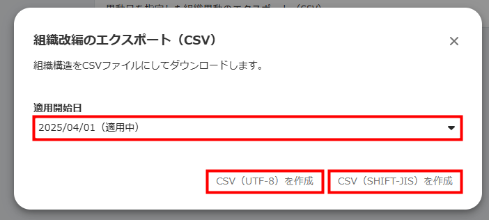 - 「組織改編のエクスポート(CSV)」画面で「適用開始日」を選択し、「CSV(UTF-8)を作成」または「CSV(SHIFT-JIS)を作成」をクリックします。