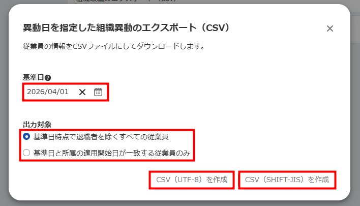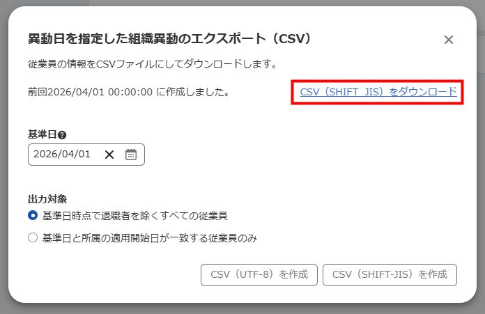 - 「異動日を指定した組織異動のエクスポート(CSV)」画面で「基準日」と「出力対象」を選択し、「CSV(UTF-8)を作成」または「CSV(SHIFT-JIS)を作成」をクリックします。