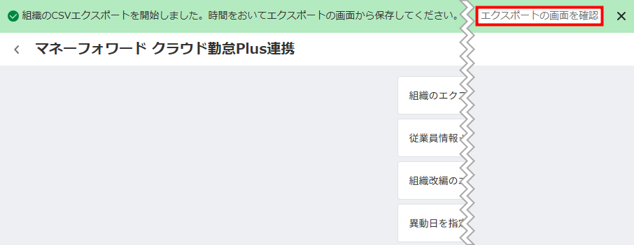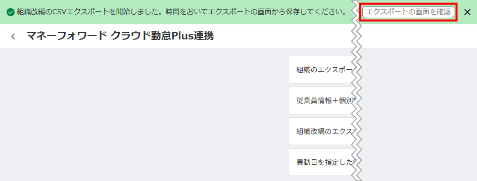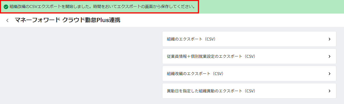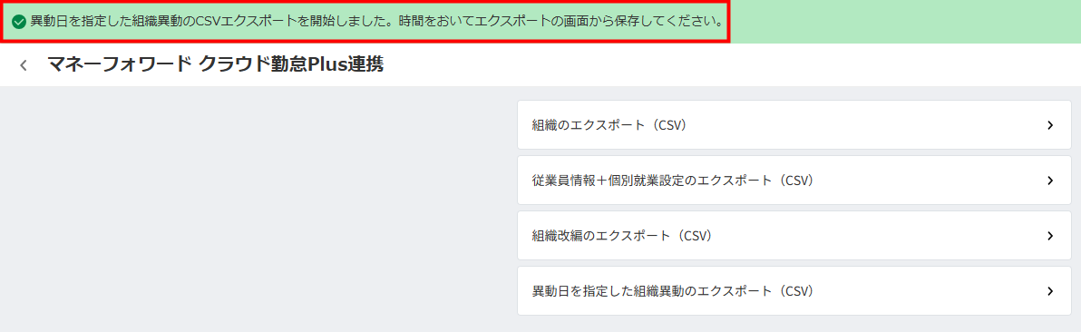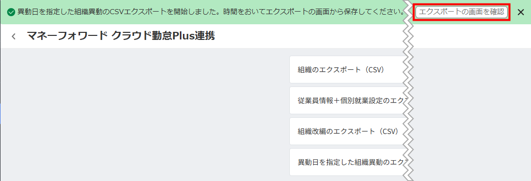 - 画面上部に「異動日を指定した組織異動のCSVエクスポートを開始しました。」というメッセージが表示されたことを確認します。