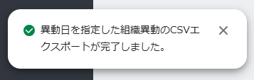 - 画面左下に「異動日を指定した組織異動のCSVエクスポートが完了しました。」というメッセージが表示されたことを確認します。