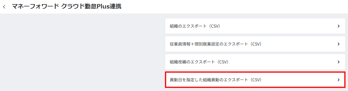 - 「マネーフォワード クラウド勤怠Plus連携」画面で「異動日を指定した組織異動のエクスポート(CSV)」をクリックします。
